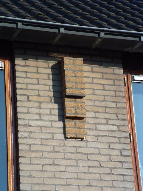 Onder de dakgoot van Rombout de Wijs is een gierzwaluwen-nestkast opgehangen die vanaf de zijkant gezien een driehoekige vorm heeft.